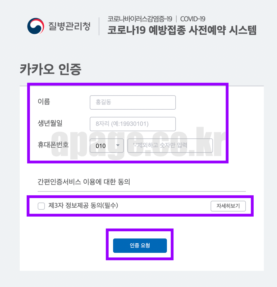 3. 카카온인증으로 진행할 경우, 본인의 이름, 성년월일, 휴대폰 번호를 입력하고 제 3자 정보제공 동의 필수에 선택합니다.