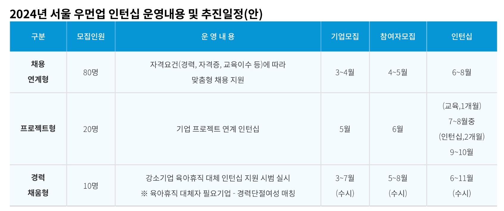 올해 채용 계획이 있거나 육아휴직자가 있는 기업의 경우 ‘서울우먼업’ 누리집(https://www.seoulwomanup.or.kr/womanup/main/main.do)을 통해 인턴십 사업 일정을 확인할 수 있습니다.