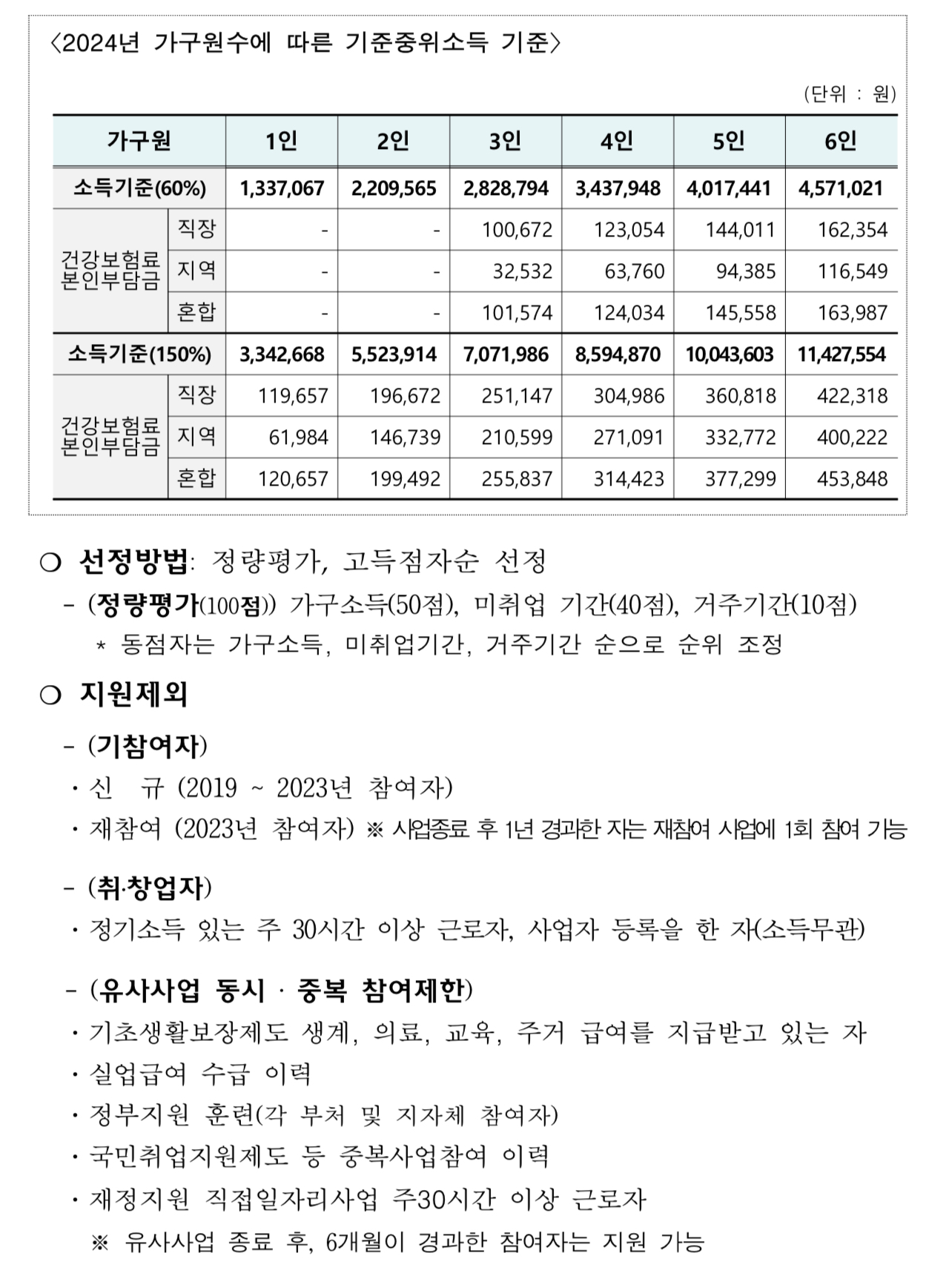 ※ 모집시작일 전 3개월(2023년 11월~12월, 2024년 1월) 가구원의 평균 건강보험료 납부(부과)액 합산금액이 가구소득 산정표의 기준 중위소득 요건 범위에 해당되어야 함.