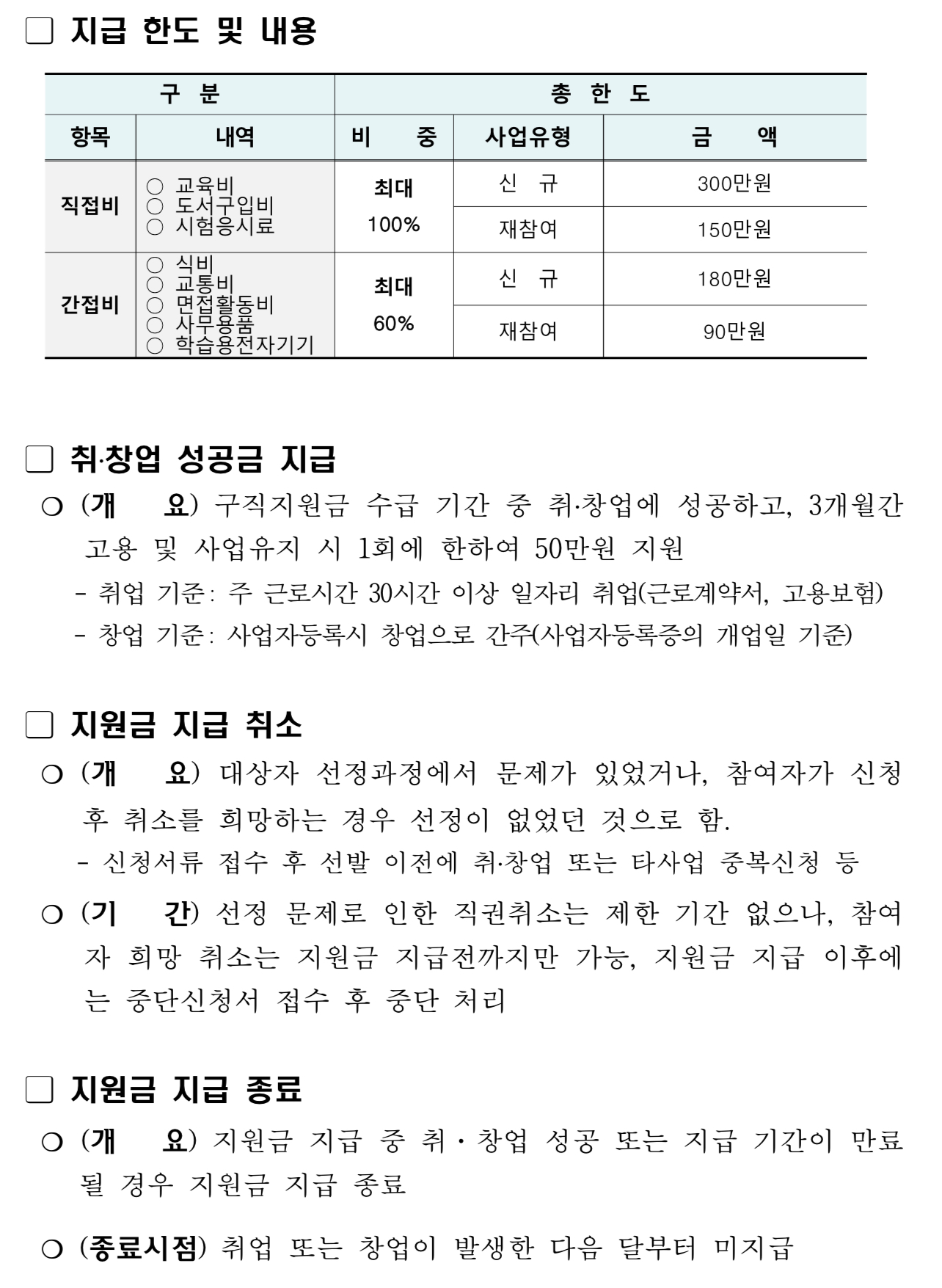 - 지원기간 중(구직활동비 2회 차 이상 지급 이후) 취·창업하여 3개월 근속 시 취·창업성공금 50만원 지원(지원금 전액 지원받거나 도외로 주소지를 이전한 경우는 성공금 제외)