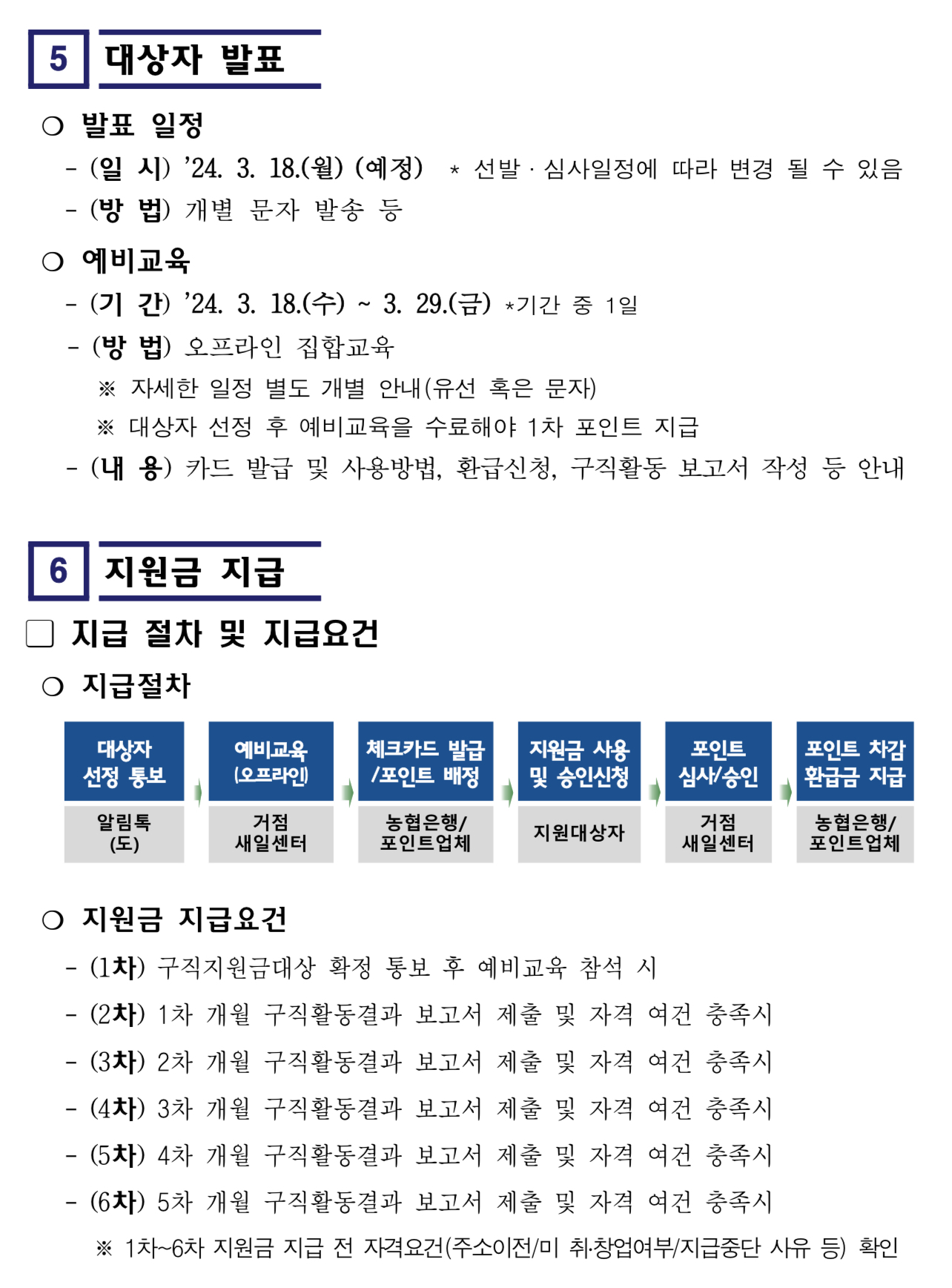- 선정 결과 발표 이후, 참여자를 대상으로 지원금 사용방법 및 참여자 의무사항 등에 대한 예비 집합교육을 별도로 실시하오니 사업 참여자들은 필히 참여해 주시기 바랍니다.