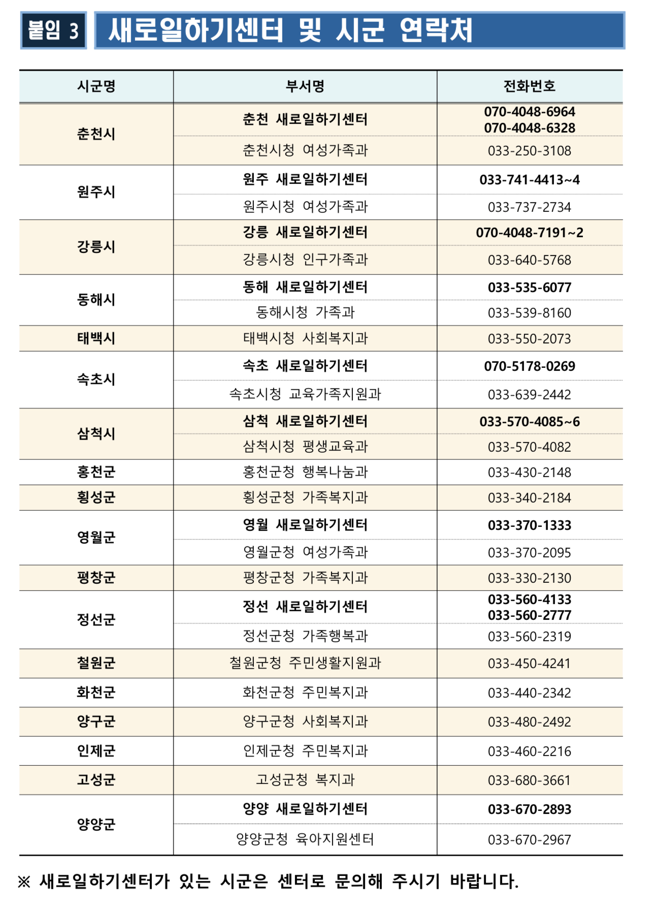춘천시, 원주시, 강릉시, 동해시, 태백시, 속초시, 삼척시, 홍천군, 횡성군, 영월군, 평창군, 정선군, 철원군, 화천군, 양구군, 인제군, 고성군, 양양군 등의 연락처를 확인하시길 바랍니다.