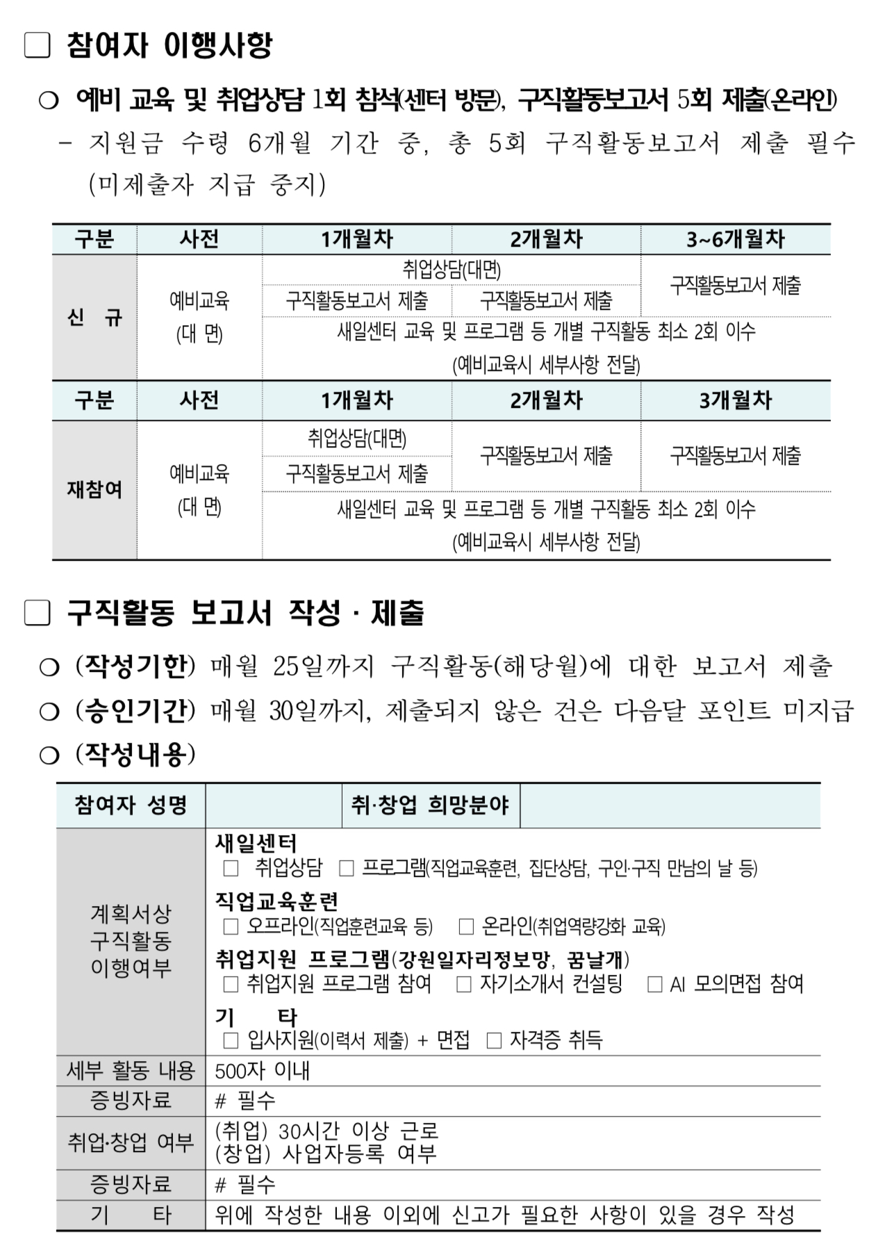 - 신청 시, 작성하는 구직활동계획서는 최종 선정 이후에 재작성하는 절차가 있으므로 작성하신 계획서는 별도로 기록해 둘 것을 권장합니다.