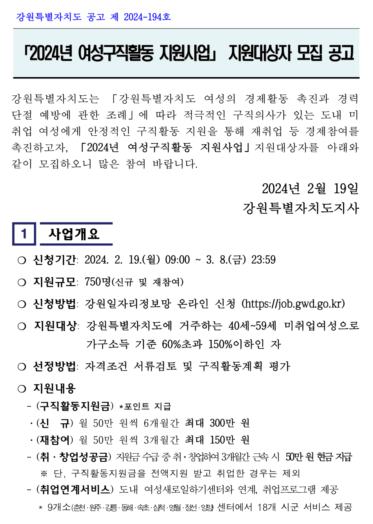 2024년 강원 여성구직활동 지원사업 안내 강원 여성구직활동 지원사업이란? 강원특별자치도에 거주하는 40세 이상 ~ 59세 이하 미취업 여성을 대상으로 월 50만원씩 최대 6개월간 취업준비 비용(포