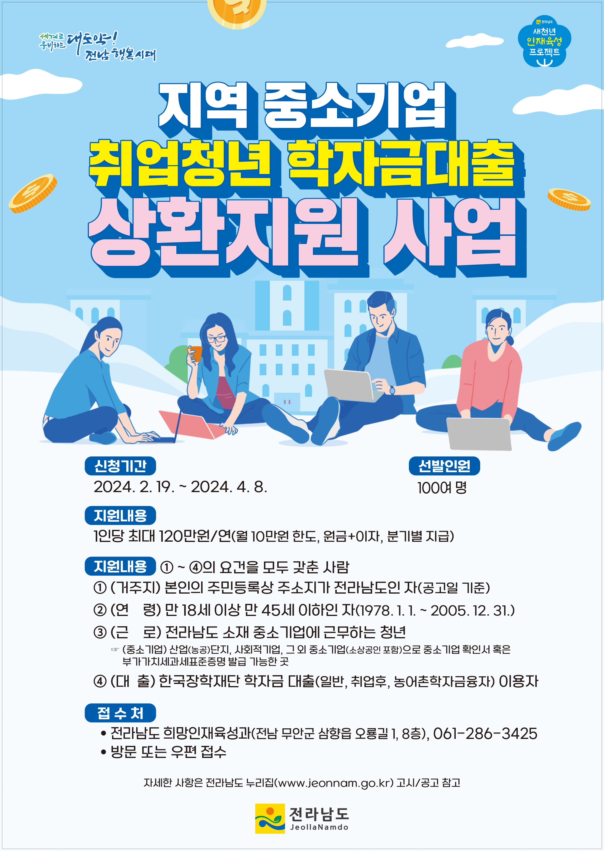 보다 자세한 사항은 전남도 누리집 고시·공고란을 참고하거나, 전남도 희망인재육성과(061-286-3425)로 문의하면 됩니다.