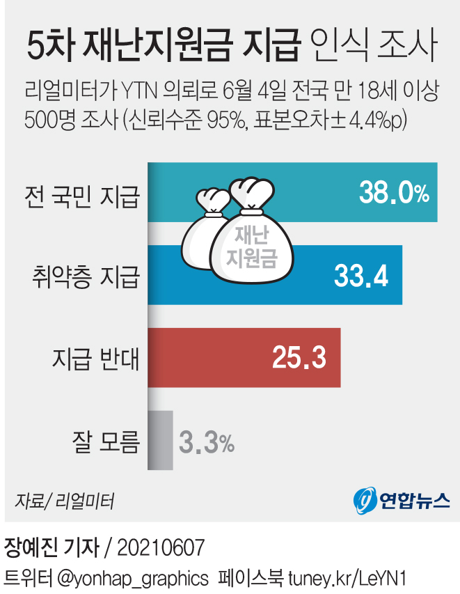 5차 재난지원금…전국민 38.0% 선별 33.4% 지급반대 25.3% | 연합뉴스
