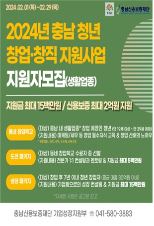마지막으로 자세한 내용은 충남신용보증재단(생활창업, ☎041-530-3883), 충남창조경제혁신센터(기술창업, ☎041-536-7878)로 전화하거나 각 기관 누리집에서 확인할 수 있습니다.