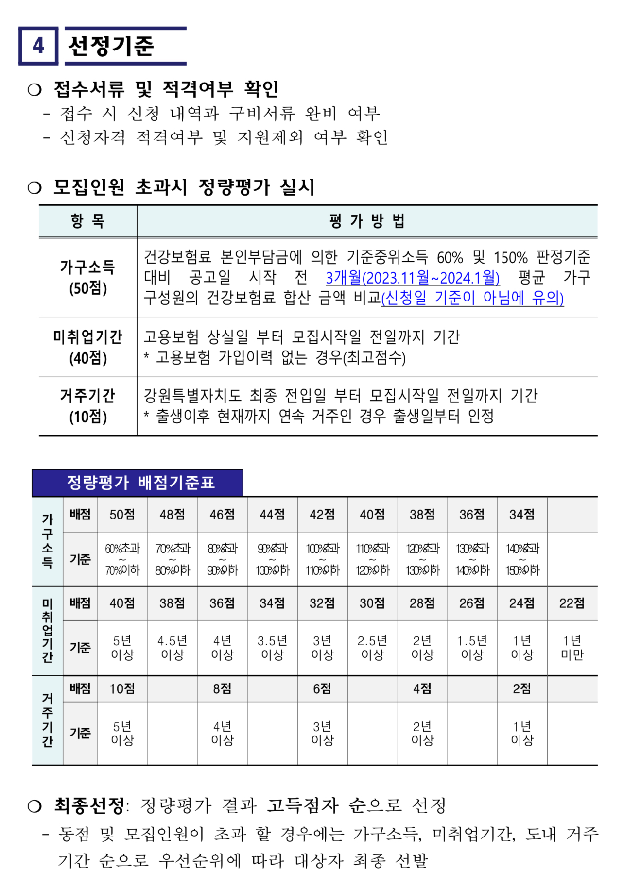 ※ 모집시작일 전 3개월(2023년 11월~12월, 2024년 1월) 가구원의 평균 건강보험료 납부(부과)액 합산금액이 가구소득 산정표의 기준 중위소득 요건 범위에 해당되어야 함.